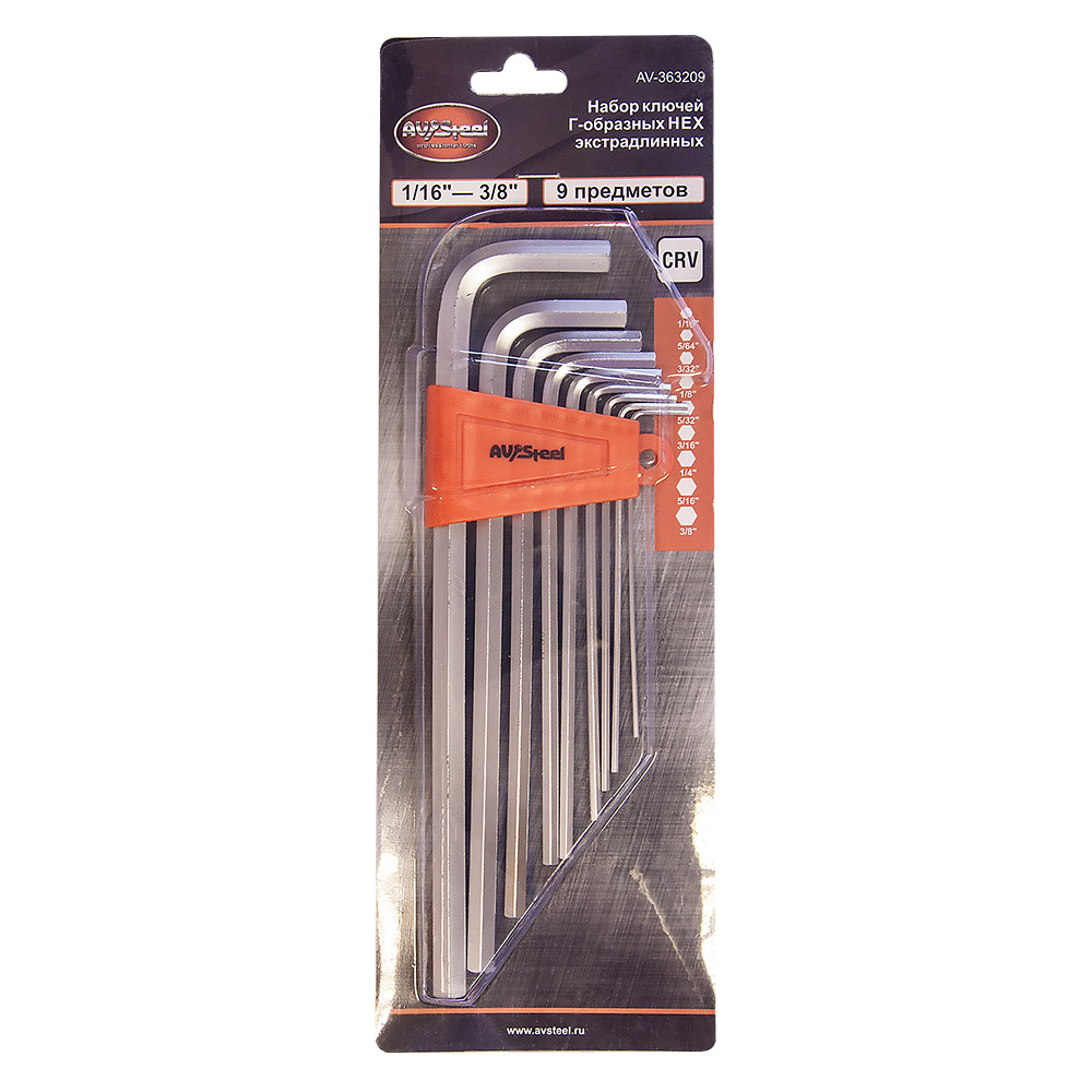 Набор ключей Г-образных HEX 9 предметов 1/16"-3/8" экстрадлинных "AV Steel" AV-363209
