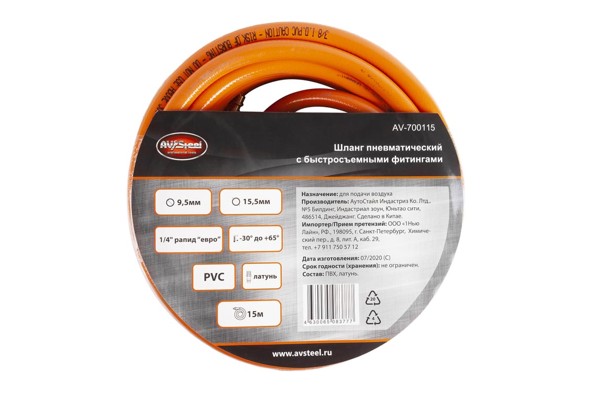 Шланг пневматический Steel AV-700110 предназначен для подсоединения рабочего пневматического инструмента к компрессору. Выполнен из ПВХ. Длина 10 метров.